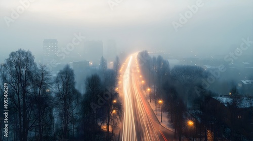Foggy night road with glowing street lights and car light trails, moody urban landscape for atmospheric background design