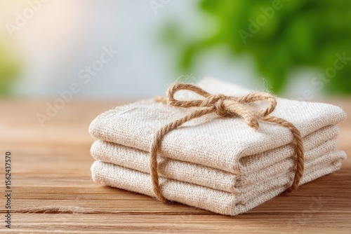 folded, clothes, napkin, tied, biodegradable, twine, wooden, table, warm, natural, daylight, blurred, homely, background, neutral, rustic, tone, clean, composition, generous, copy space, up high, illustrating, recyclable, textile, reduction, paper, product, sharpened, scene, high-quality, concept, colours, empty space, minimal, style, art, simplicity, detail