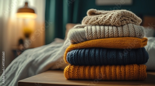 Folded knitted sweaters in various colors, stacked on a wooden surface.