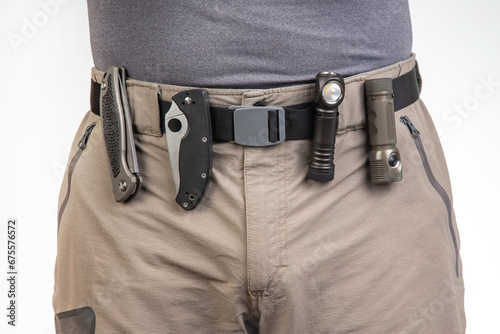 folding knife and a flashlight with clips on the belt of a tourist trekking trousers. EDC items