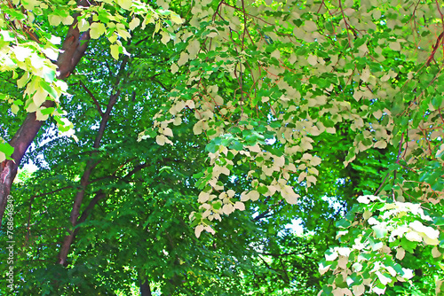 Foliage of linden tree (white leaves - back view of linden foliage) in the park