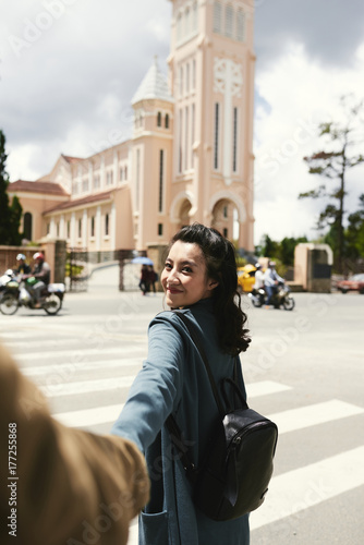 asian, vietnamese, woman, young, standing, photographing, traveling, trip, street, town, girlfriend, boyfriend, man, couple, traveler, sightseeing, people, holding, hand, following, romantic, love, beautiful, leading, smiling