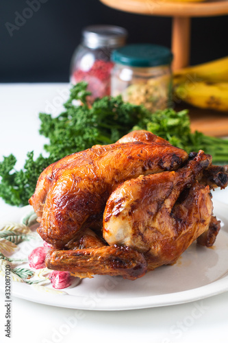Food concept homemade Roasted, Grilled Whole organic chicken on white ceramic plate