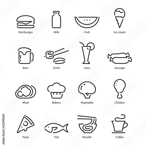 food, hamburger, milk, drink, fruit, ice cream, beer, sushi, juice, sausage, water, meat, bakery, vegetable, chicken, pizza, fish, noodle, hot drink, icon, set, logotype, signs, symbol, element, line, outline, minimal, white, black, background, isolate, clip art, vector