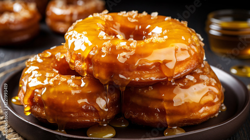 Food photography of Christmas glazed donuts topped with honey, showcasing a festive, sweet, and indulgent treat.