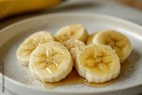 Food photography of sliced banana with honey on a white plate, on a table in the kitchen.