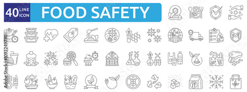 food, safety, hygiene, preparation, health, biotechnology, virus, export, nourishment, malnutrition, eatery, chemical, biological, plastic, natural, protein, temperature, raw food, organic, fresh food, vegetarian, eco, reusing, sugar, glacé, vector, set, symbol, line, illustration, isolated, signs