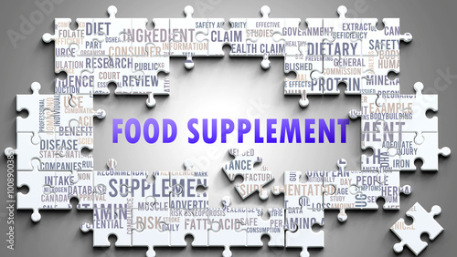 Food Supplement as a complex subject, related to important topics. Pictured as a puzzle and a word cloud made of most important ideas and phrases related to food supplement. ,3d illustration