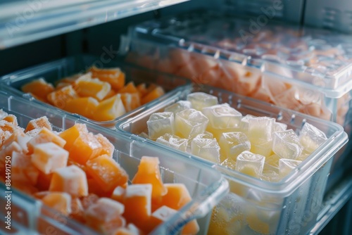Food that has been frozen in a freezer container. frozen food in a refrigerator. prepared food