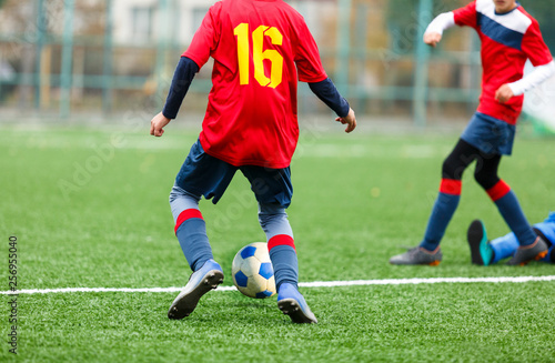 Football training for kids. Boys in blue red sportswear on soccer field. Young footballers dribble and kick ball in game. Training, active lifestyle, sport, children activity concept