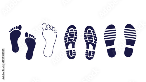footprint, track, sole, barefoot beach, step, trail, running, walking, mark, icon, symbol, set, collection, tread, athletic, sneaker, boot, sport, outline, human, health, fitness, movement, direction, guide, navigation, vector, illustration, design element, dark blue, graphic, simple, diagram, trace, foot, body, rubber, hiking, pictogram