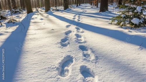 snow, footprint, winter, forest, path, trail, tree, sunlight, shadow, ground, cold, season, nature, landscape, outdoors, white, wood, footprint, walking, adventure, journey, exploration, travel, calmness, peaceful, quiet, serene, calm, glacé, ice, frost, scenic, beauty, pristine, untouched, wilderness, solitude, nobody, bare, branch, sun, light, bright, day, clear, crisp, fresh, air