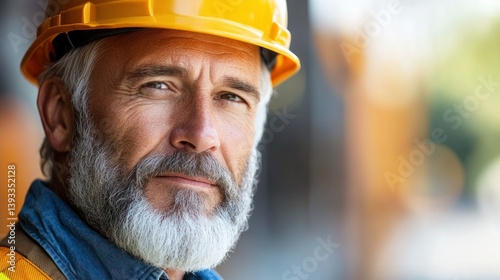 man, construction, men at work, hard hat, safety, engineering, beard, grey, face, portrait, mature, industry, professional, uniform, outdoors, builder, site, leader, manager, supervisor, expert, experienced, responsible, confident, serious, focused, occupation, job, work, building, development, teamwork, project, design, steel, structure, architecture, urban, exterior, background, blurred, bokeh, depth, field, sunlight, day, sunny, strength, expertise