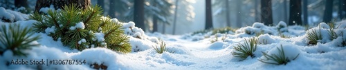 Forest floor, covered in fresh snow, pine needles, evergreen, landscape