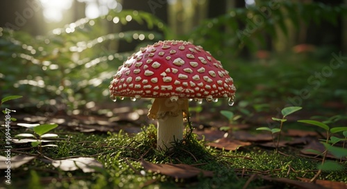 Forest mushroom, vibrant red and white, glistening with morning dew