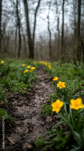 daffodil, spring flower, timberland, yellow flower, trail, outdoors, blooming, nature, pathway, greengrass, tree, cloudy day, springtime, blossom, wildflower, countryside, rural, calm, peaceful, nature scene, fresh, fresh air, natural light, walk, path, spring, yellow, country, flower, wood, garden, daffodil, creative, technology