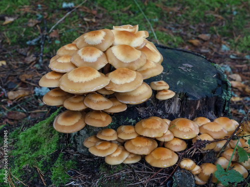 Forest poisonous mushrooms. False mushrooms are small with brown shiny caps, growing in bunches on an old tree stump