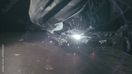 Forge workshop. Smithy. Worker in a welding hood helmet welds a part by electric welding. Sparks are reflected in the protective screen. Blacksmith makes iron product for manufacture. Slow motion.