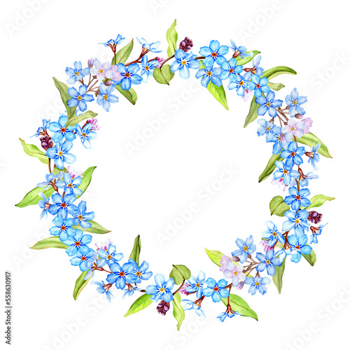 Forget-me-not flowers wreath, watercolor illustration, isolated on white.