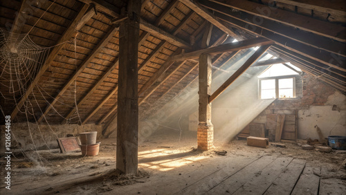forgotten attic with exposed wooden beams, dust particles in sunlight
