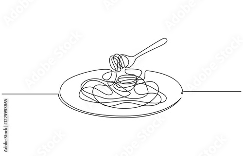 Fork with pasta in One Continuous line drawing. Italian spaghetti noodle for web banner and food, Pasta spaghetti noodle with fork in one continuous single line style isolated on white background.
