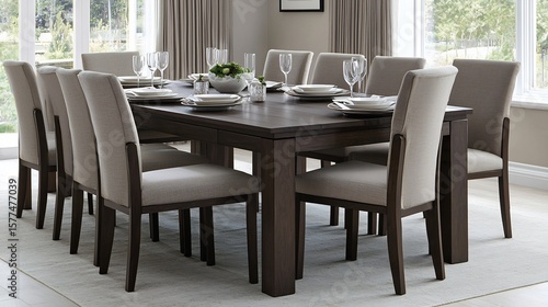 dining, table, chair, furniture, interior, design, elegant, formal, modern, room, setting, dinnerware, goggles, decor, upholstery, seating, layout, arrangement, centrepiece, home, indoor, window, curtain, wood, surface, crockery, tableware, furnishing, domestic, lifestyle, comfort, style, eat, space, family, gathering, celebration, event, occasion, meal, place