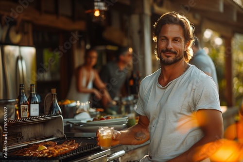 Forties Man Enjoying Cocktail by the Grill at Beautiful Country House with Friends