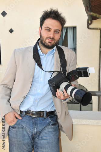 photographer, young, guy, man, model, reflex camera, to, work, blue, work, like, image, photo, equipment, photographic, at, jacket