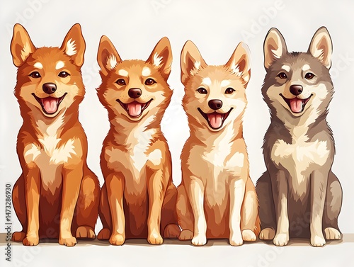 Four adorable cartoon Shiba Inu puppies sit together smiling happily in a row showcasing different fur colors.