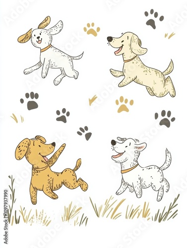 doodle, dog, illustration, playful, grass, sunny, paw, print, pet, cute, animal, art, running, cartoon, cheerful, sketch, canino, fun, nature, brown, dog, white, lively, whimsical, design, creativity, happiness, style, joyful, animated, character, lover, pet, illustration, furry, friends, colourful, children, generative, ai