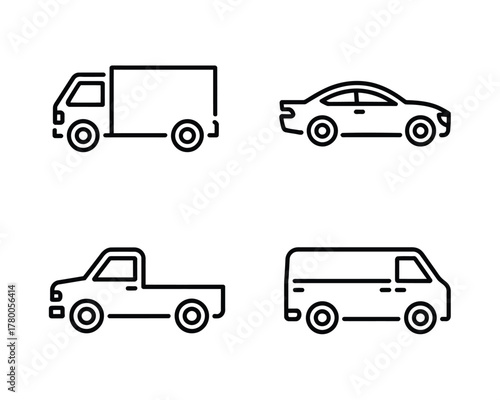 truck, car, pickup, van, delivery, transport, vehicle, icon, line art, black-and-white, simple, graphic, illustration, outline, set, collection, logistic, automobile, commercial, utility, sedan, cargo