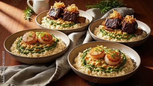 food, dish, meal, bowl, rice, scallop, seafood, meat, braised, epicure, main, course, dinner, lunch, cookery, eatery, presentation, photo, savoury, delicious, plated, individual, comfort, gastronomy, styling, seared, rich, flavorful
