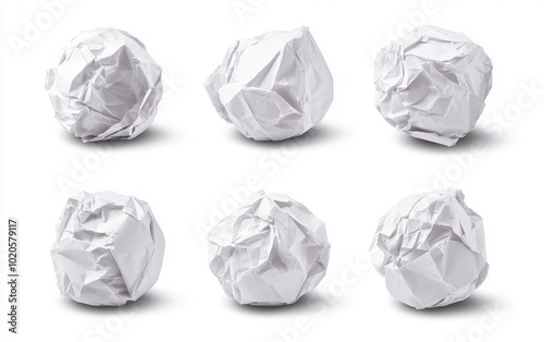 Four crumpled paper balls with realistic textures, isolated on white, perfect for office-themed designs, mistakes, or concept development visuals