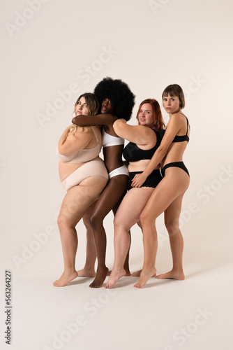 Four diverse and strong women of different nationalities and body types confidently pose in lingerie. Body positivity and feminism concept.