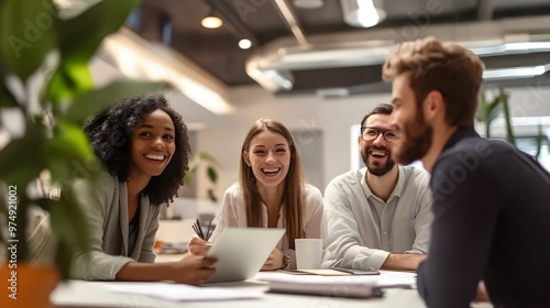 meeting, colleague, work, office, teamwork, diverse, group, laughing, happy, smiling, cheerful, positive, collaboration, discussion, sharpened, conversation, professional, successful, business, casual attire, friendly, relaxed, comfortable, modern, workplace, creative, presentation, project, team, desk, table, paper, document, laptop, pen, goggles, beard, woman, man, white, grey, black, brown, light, blurry, background