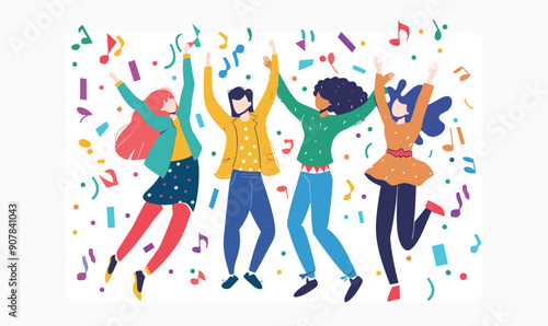 dancing, diverse, individual, colourful, confetti, musical, note, casual attire, vibrant, clothing, isolated, white, background, mixed, ethnicity, group, celebrate, joyful, 20s, 30s, vector, art, happy, friends, party, fun, festive, mood, theme, graphic, design, illustration, excitement, expressive, enjoying, celebration, artistic, entertainer, cool, movement, dynamic, modern, cartoon, flat, figure, synchronized, bright, 4