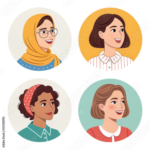 Four Diverse Women Portraits Circular Avatar Set, Isolated on Transparent Background, Women, Avatar, Illustration