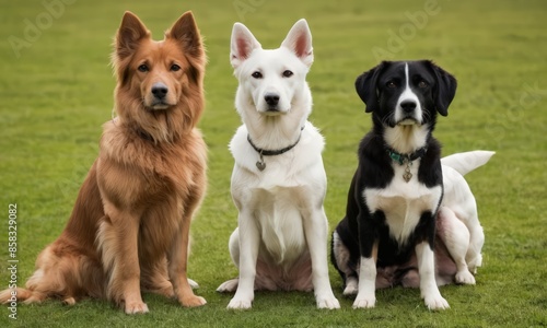 dog, white dog, black dog, brown dog, white, black, red, grass, field