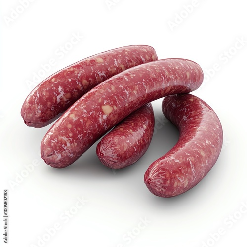 Four fresh raw sausages with a rich red color on a white isolated background.