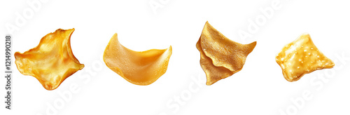 Four golden-brown, crispy snacks fall against a black background showcasing their texture and appetizing appearance.