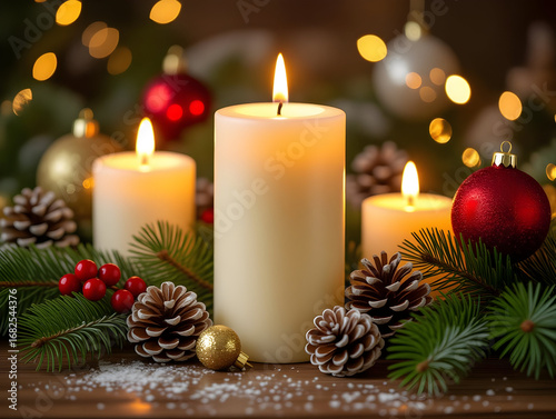 Four lit white pillar candles with pine branches red baubles and pinecones on a wooden surface with scattered snow and bokeh lights