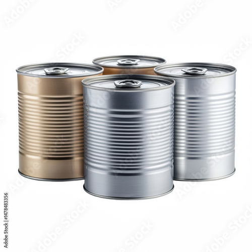 Four metallic food cans with ribbed sides isolated PNG with Transparent Background