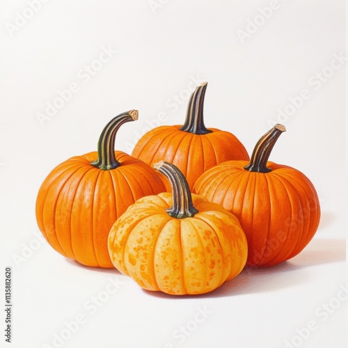 pumpkin, orange, autumn, fall, squash, vegetable, gourd, white background, harvest, still life, food, seasonal, halloween, thanksgiving, fresh, organic, ripe, stem, isolated, group, closeup, produce, bright, vibrant, colours