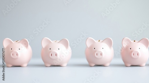 Four Piggy Banks Minimalist Style High-Resolution Photography Straight-on Row Savings Concept Neutral Background Pale Pink Tones Ideal for Finance Ads