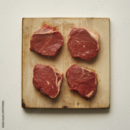 Four Raw Beef Steaks on Wooden Cutting Board