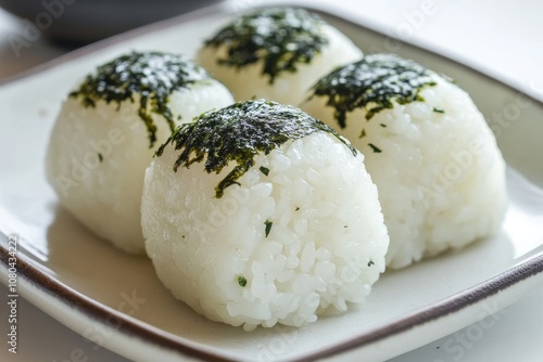 Four rice balls topped with seaweed. A perfect image for food blogs or to illustrate Japanese cuisine.