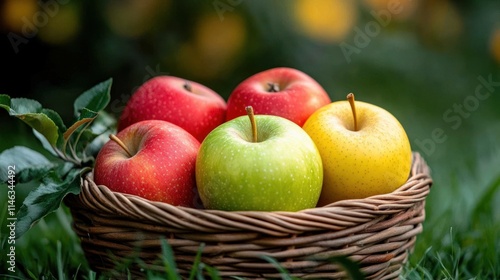 Four ripe apples, red, green, and yellow, in a wicker basket on grass.