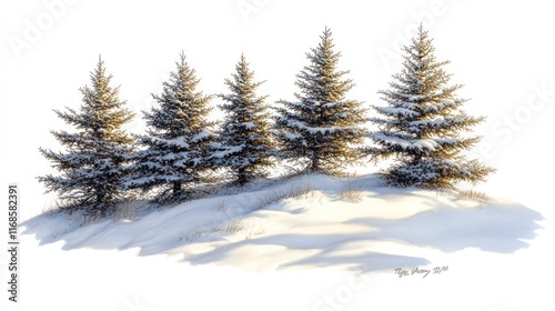 Four snow-covered evergreen trees on a snowy hill against a white background.