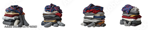 Four Stacks of Folded Flannel Shirts and Sweaters Isolated on Transparent Background