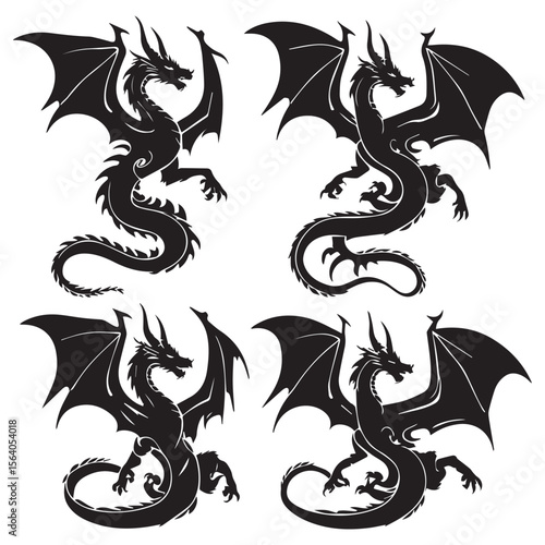 dragon, silhouette, black, white, wing, mythical, creature, fantasy, legend, monster, reptile, beast, powerful, fierce, majestic, flying, claw, talon, scale, spike, horn, tail, tribal, tattoo, design, icon, symbol, art, illustration, graphic, vector, isolated, overhead, side, view, profile, dynamic, pose, collection, set, group, ancient, mediaeval, warrior, heraldry